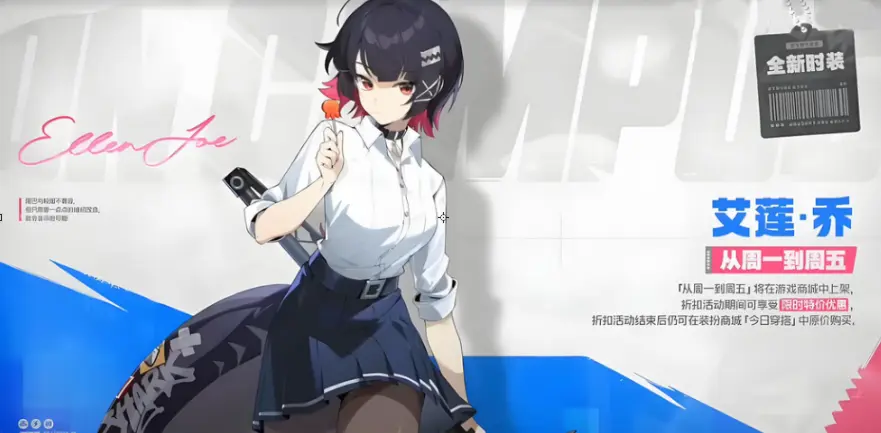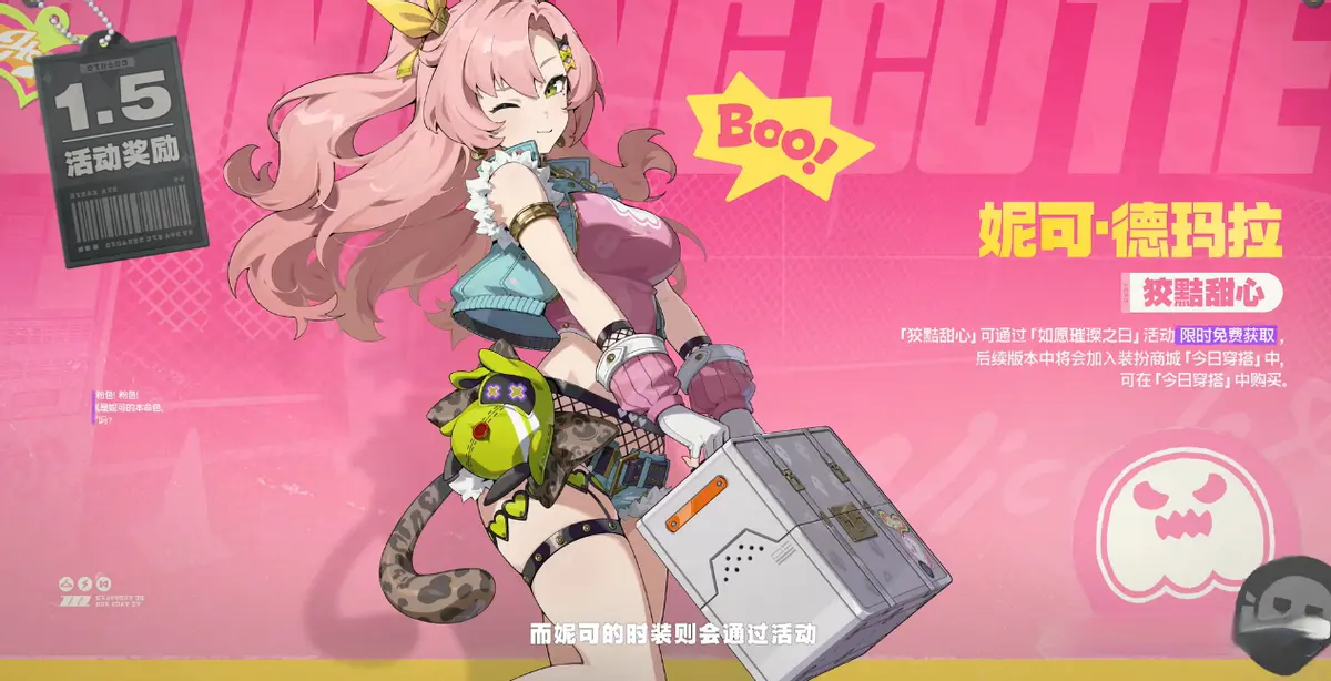 本次前瞻最最最重磅的,就是时装系统的正式落地,不仅正式落地,还同时落了三个!我们熟悉的鲨鱼妹JK——从周一到周五,本期1.5新角色耀佳音——水晶灯下,还有这期皮肤中我最喜欢的妮可皮肤——狡黠甜心,